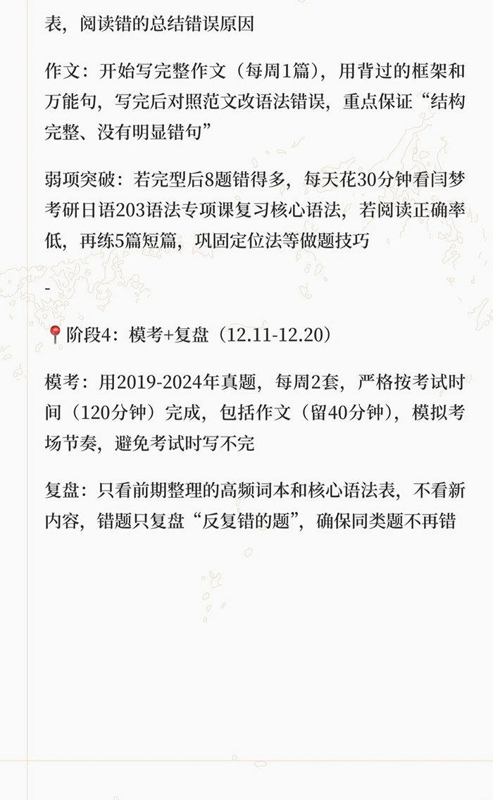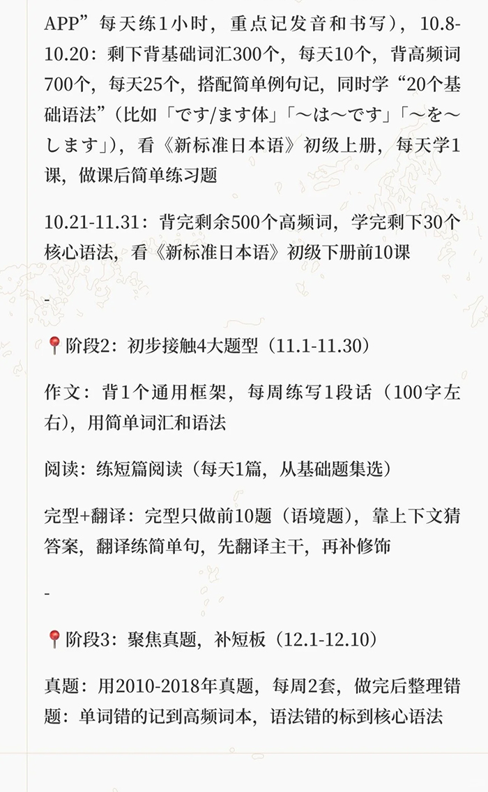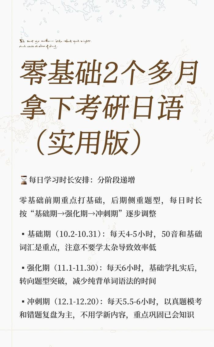 零基础2个多月拿下考研日语(实用版)零基础备考一次过线上岸的过来人想告诉同在备考的朋友,准备考研日语203的时候不用慌,按着“打基础→练题型→稳应试”的节奏推进,哪怕从50音开始,还是能稳过国家线(38-46分)的,冲一冲还有可能拿60-70分呢,下面从每日时长、备考重点、具体规划三个维度,分享一下经验